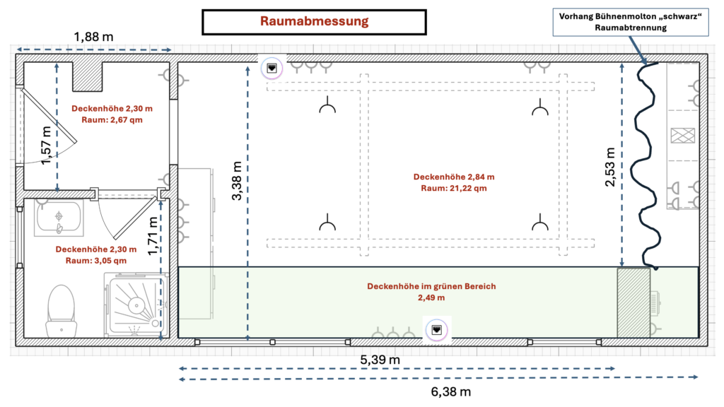 Entdecken Sie den Grundriss unseres Studio-Lounge, Ein helles, vielseitiges Raumkonzept mit großem Hauptraum, separater Deko- und Sanitärbereich. Das Studio ist vollständig ausgestattet mit Deckenbeleuchtung, Steckdosen, Netzwerkanschlüssen und professioneller Schienen Deckensystem. Ideal für Portraits, Fashion, Product- oder Video-Shootings.