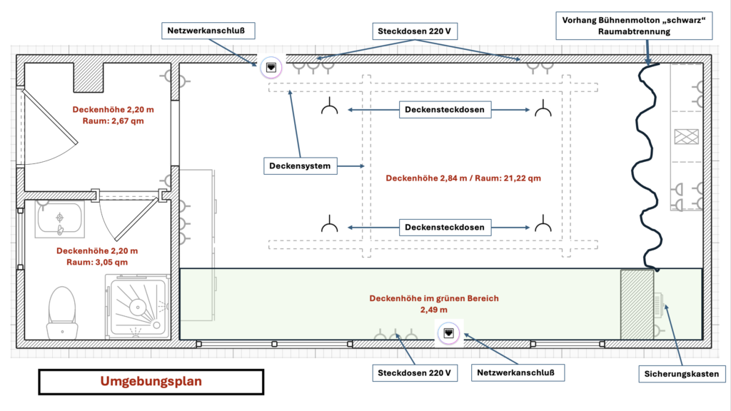 • Technik: Schienen Deckensystem (variabel), Steckdosen, Netzwerkanschlüsse, WLAN, Stative